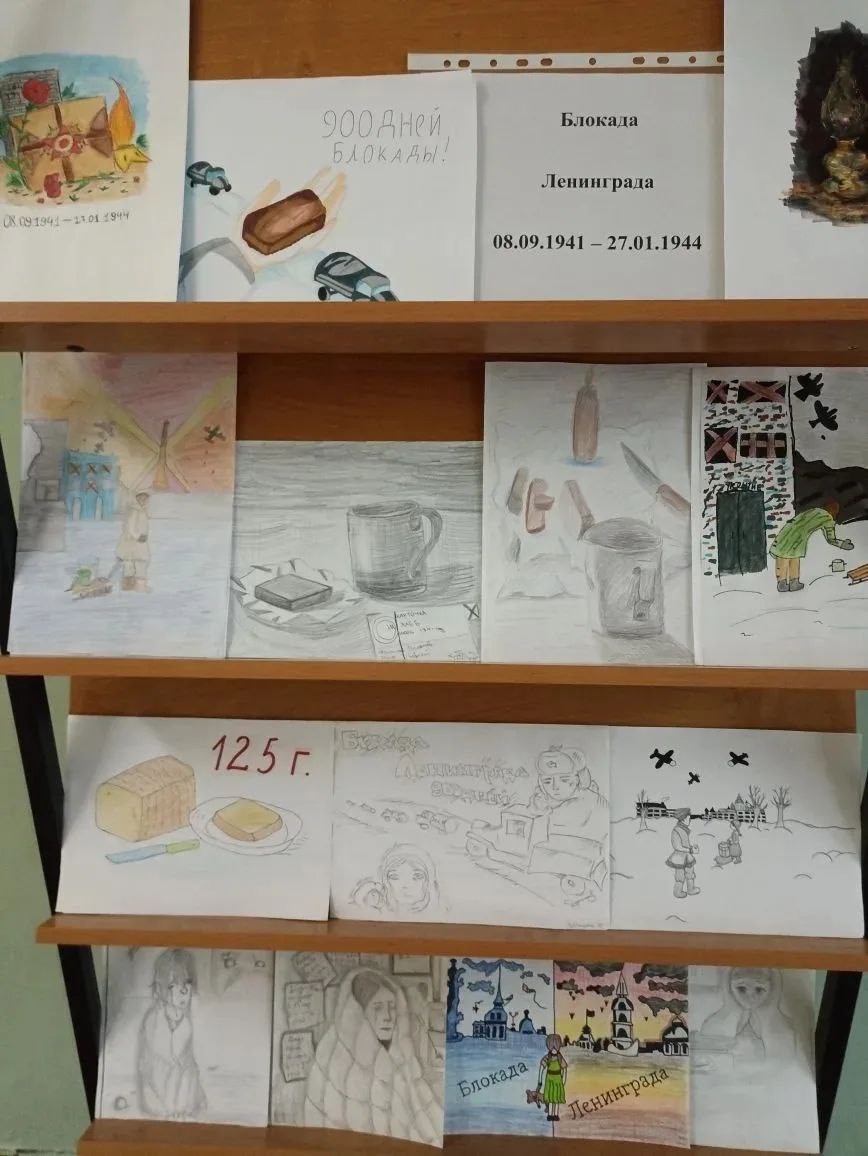 Учащиеся 5-х и 7-х класс подготовили выставку рисунков " Блокадный Ленинград ", посвященную героическим событиям военных лет. Учитель: Спиридонова Н. И.