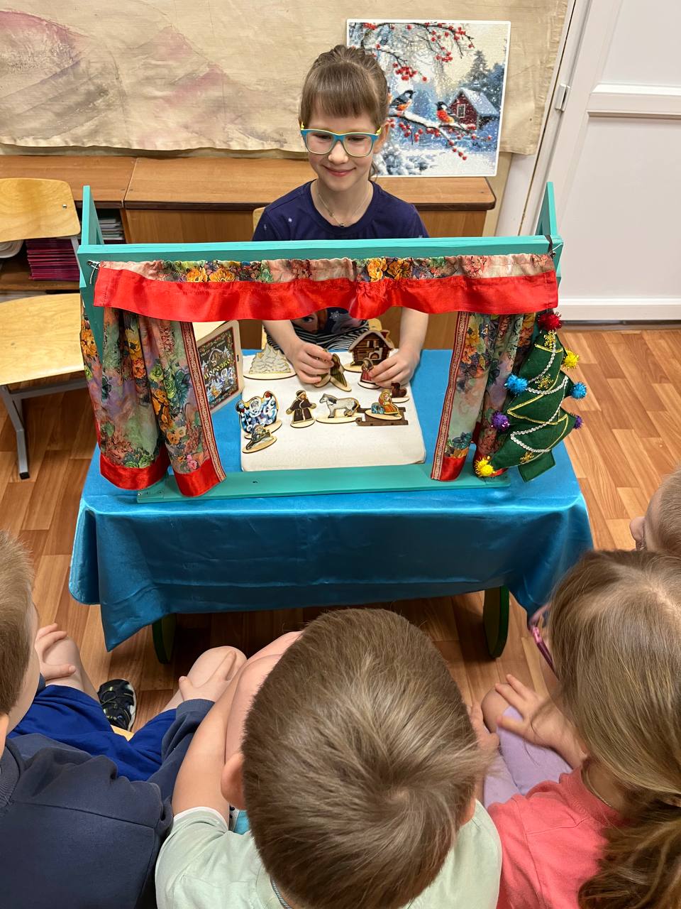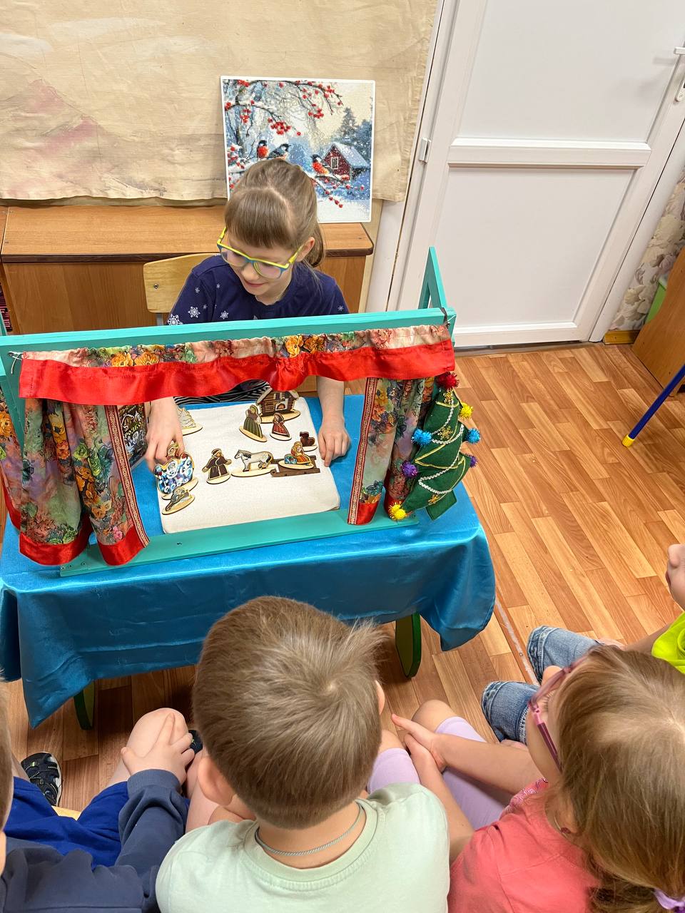 В рамках реализации проекта "Предшкола.Стандарт детского сада» на тематической неделе «Театр детей» воспитанники подготовительной к школе группы 7 проигрывали вариации сказки «Морозко» разными видами кукольного театра Цель:развитие у детей эмоционального интеллекта посредством театрализованной игры по сказке «Морозко» А.Н. Афанасьева.Результат: Дети демонстрируют умение договариваться в процессе распределения ролей, в процессе планирования игрового пространства; Дети проявляют артистические качества, активно участвуют в инсценировке Дети демонстрируют творческие способности, умение вести диалог; У детейсформированы умения с помощью средств интонационной выразительности передавать различные эмоции