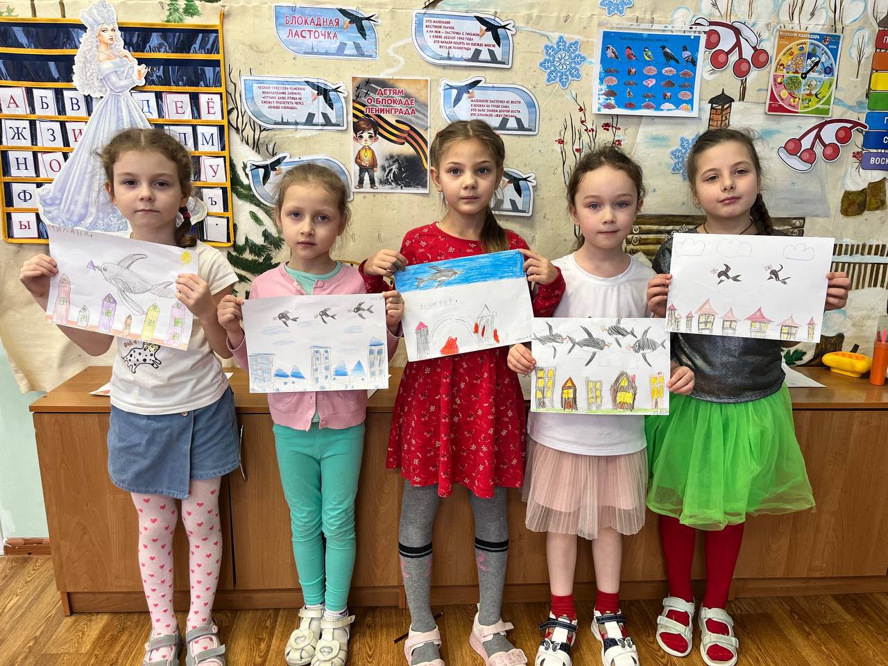 После познавательной беседы ребята выполнили рисунки, на которых изобразили блокадных ласточек, несущих добрые вести.
