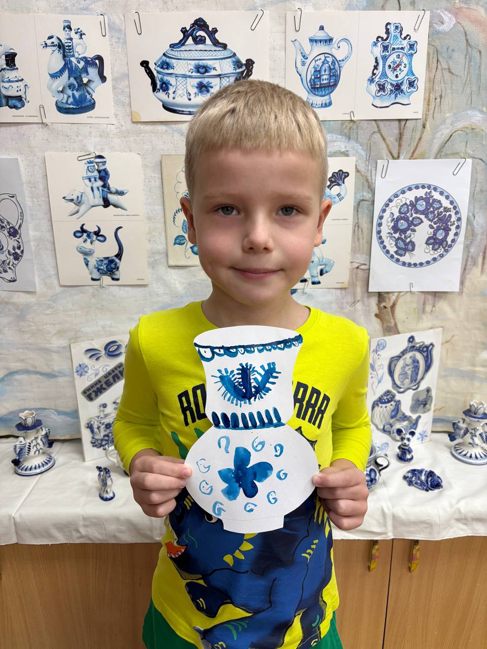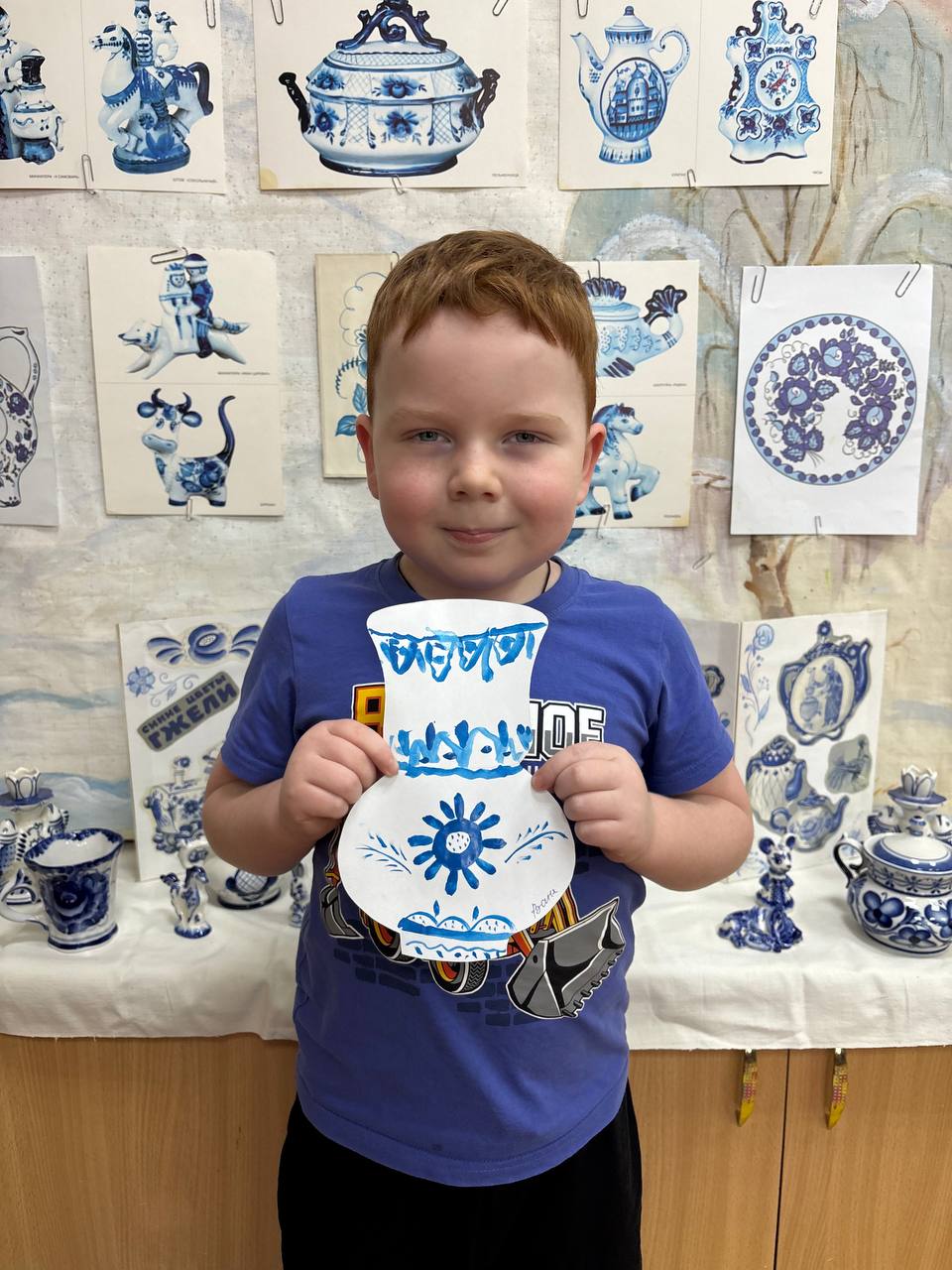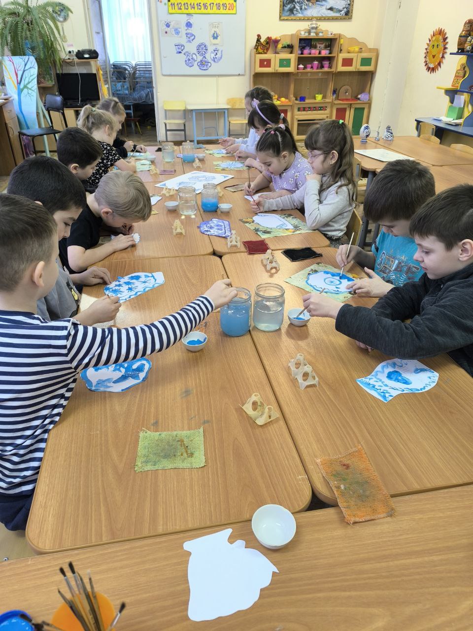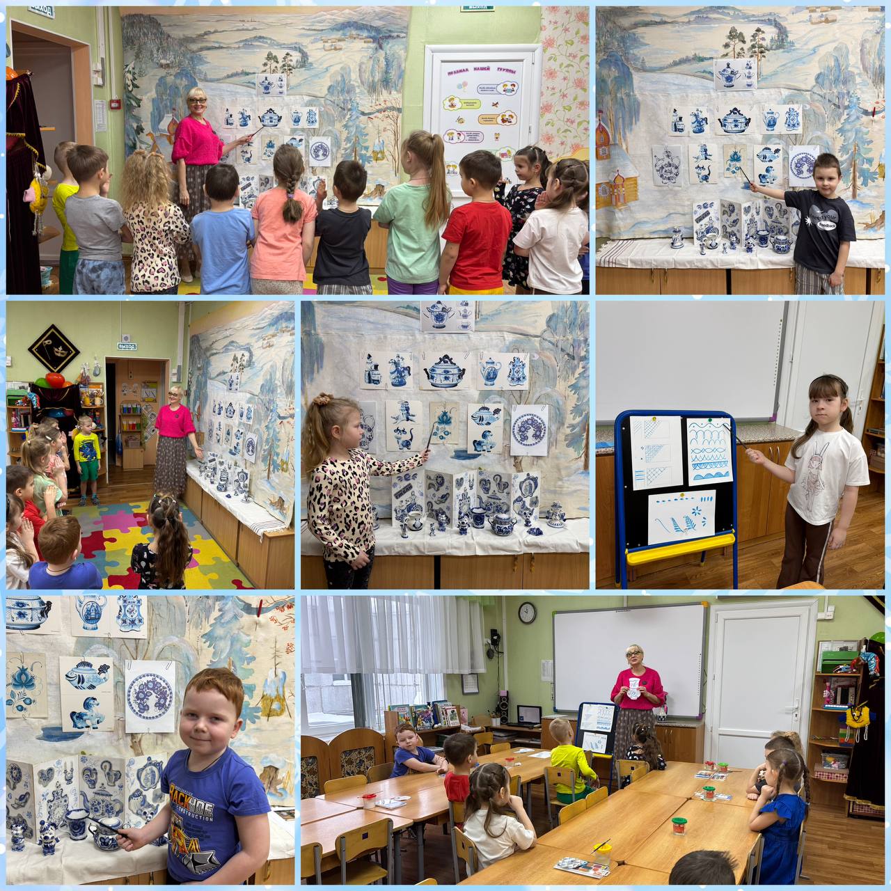 «День народных промыслов» Мероприятия масленичной недели. Всю неделю в группах детского сада проводятся тематические занятия художественно- эстетичесого цикла по росписи предметов народно- прикладного искусства дети подготовительной группы «Светлячки», погрузились в сине-белую сказку! На занятии «Сказочная гжель» ребята узнали секреты старинного промысла: от тонкостей формовки до изящной кистевой росписи. Рассматривали изящную посуду, забавные фигурки и миниатюры, вдохновлялись синими узорами на белоснежном фоне. А потом сами стали художниками и расписали свои волшебные вазочки!